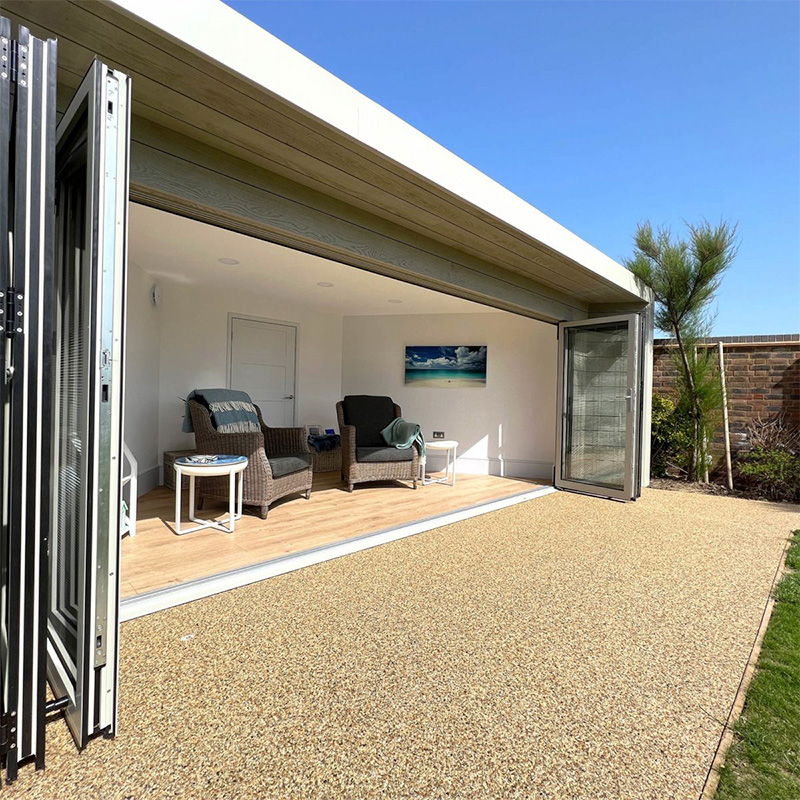 All annexes are built using a SIPs (Structural Insulated Panel) core, creating a robust and highly insulated shell that ensures year-round comfort. This multi-layered system delivers excellent thermal performance, while allowing flexibility in interior and exterior finishes. External cladding, roof finishes, and glazing options can all be selected to suit the garden and the architectural feel of the main home.