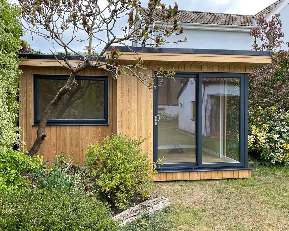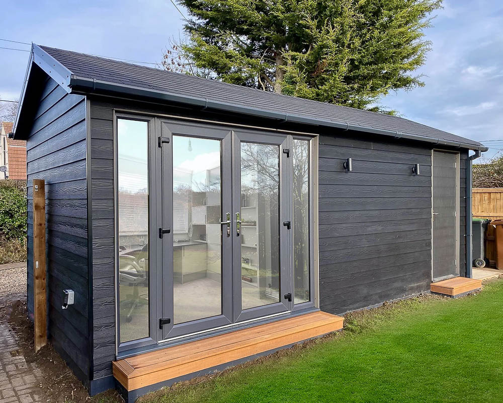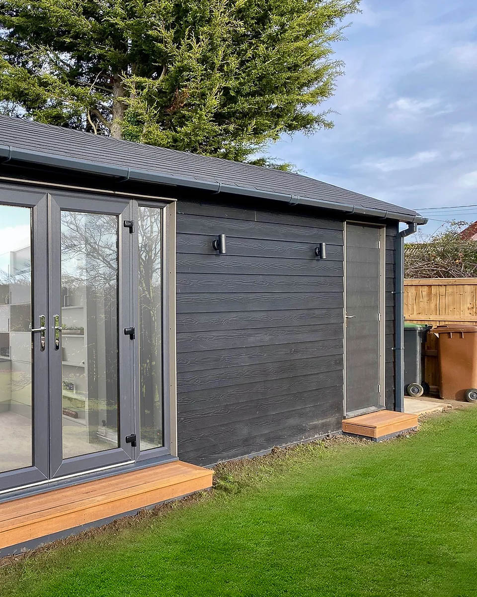 Clients choose from four starting ranges, then tailor details such as glazing positions, door arrangements, and finishes. AMC Garden Rooms offers a wide choice of external claddings, from durable natural timbers to low-maintenance composite boards in various colours and profiles.