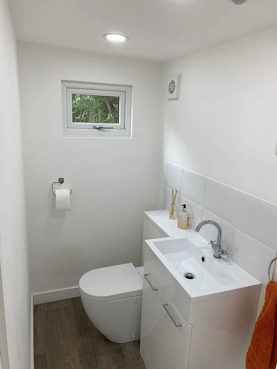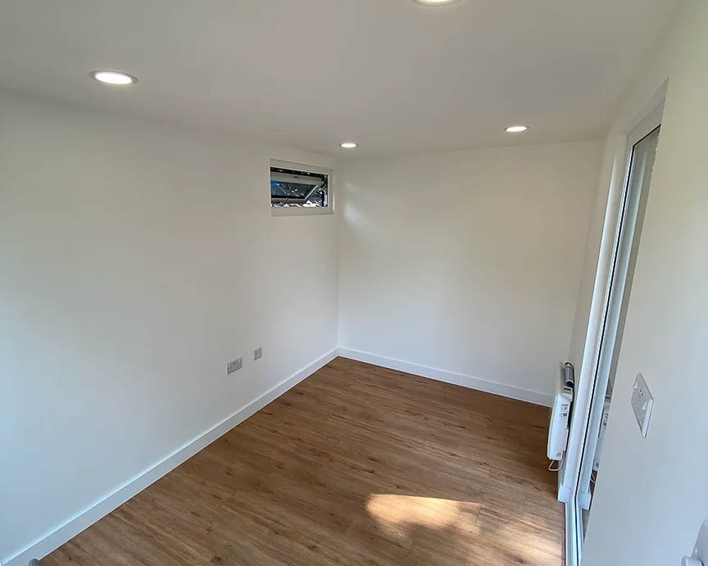 Inside, walls are plastered and decorated as standard, but durable finishes such as OSB or plywood can be specified for heavy-use creative spaces. Flooring choices include laminate and engineered wood, with rubber or other practical surfaces available where required. Kitchens, cloakrooms, and off-grid eco toilets can be incorporated, making studios more self-contained. AMC works closely with clients to configure layouts and select fixtures and finishes that reflect their creative style.