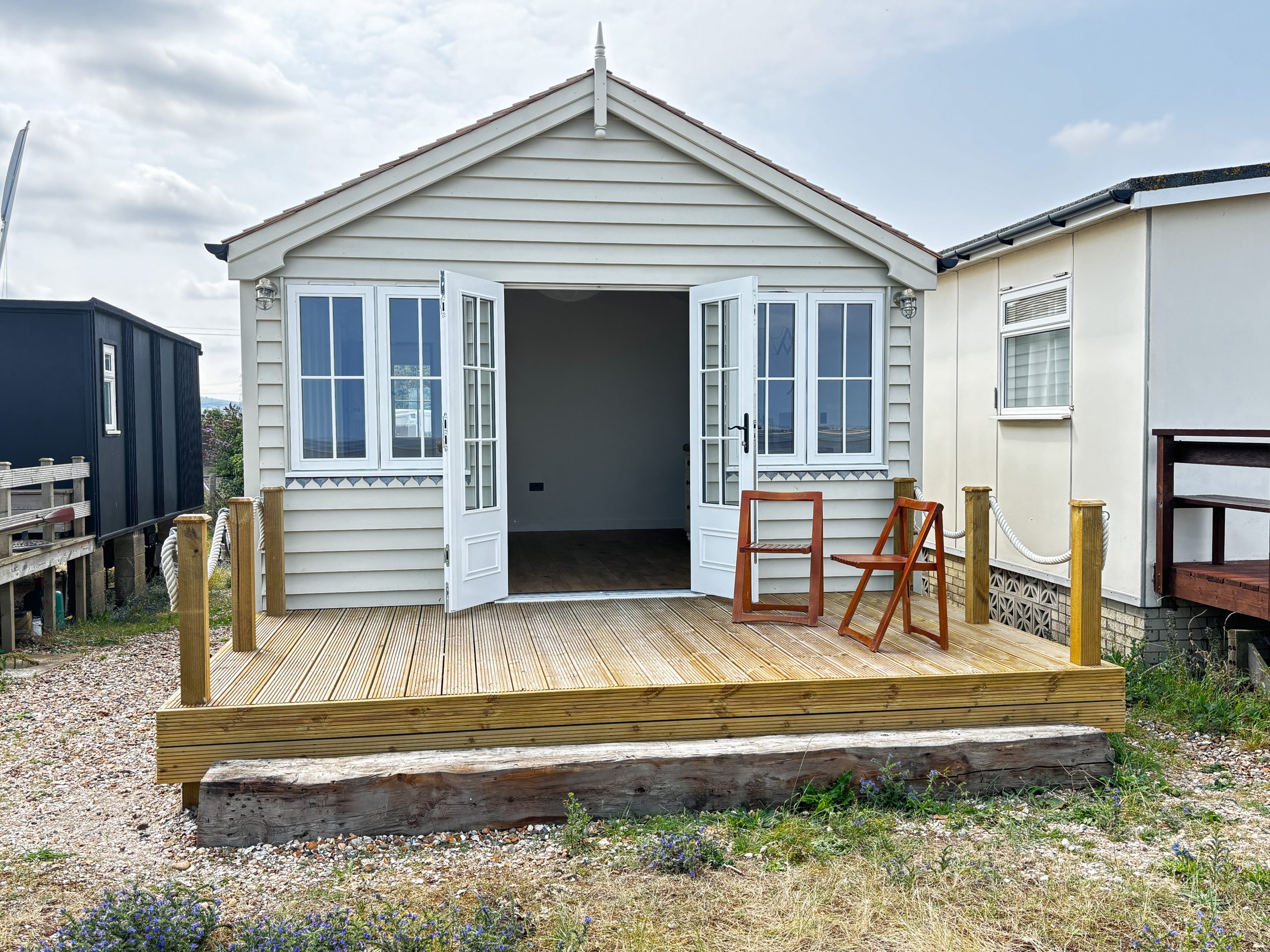 Clients are supported through each stage of design, choosing from traditional or contemporary aesthetics. The New England–style buildings feature painted weatherboard cladding, cedar shingle roofs, and refined detailing such as barge boards, finials, and lead flashing. Contemporary designs use Siberian Larch cladding and dark-framed glazing for a clean, modern look.